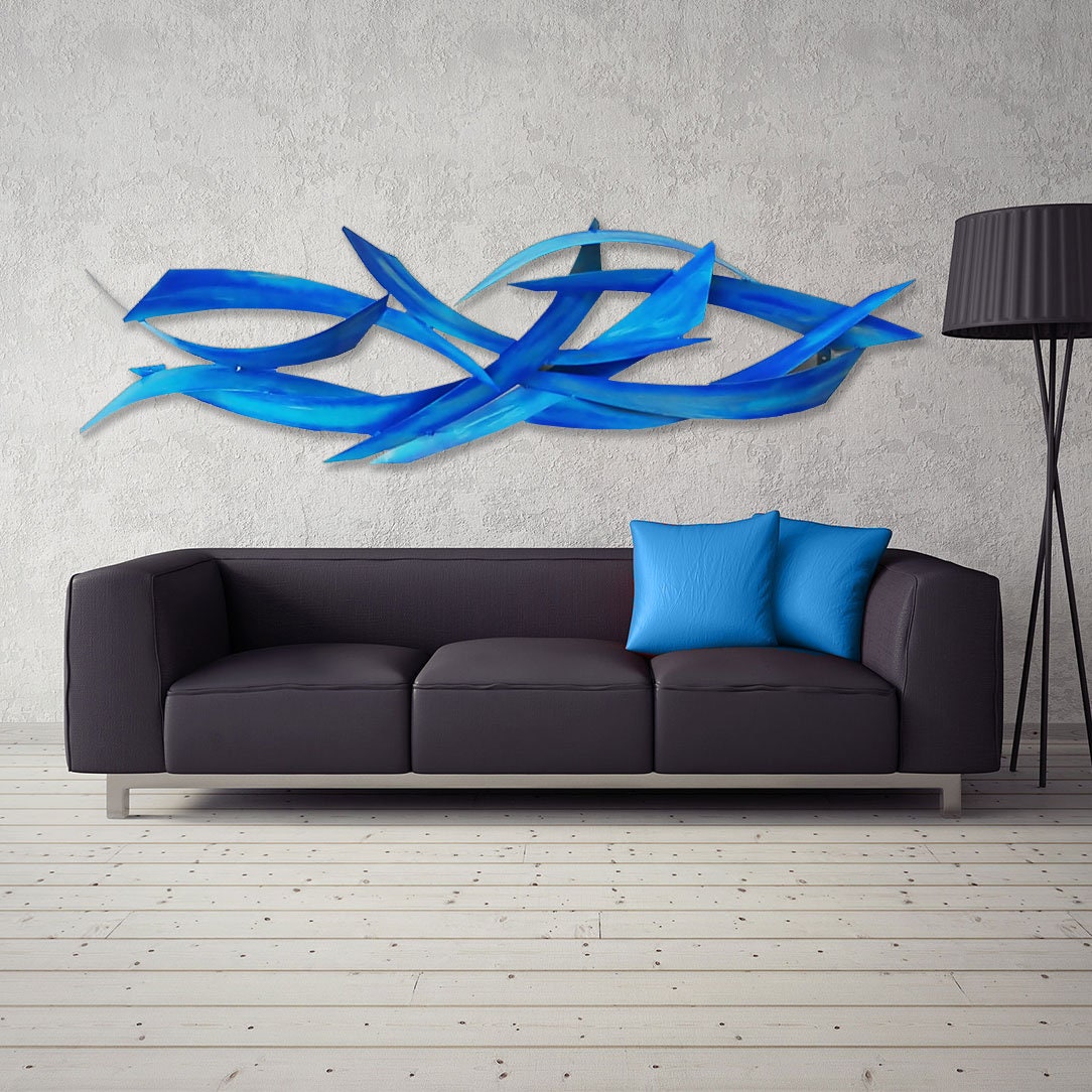 modern abstract metal wall sculpture large blue horizontal etsy