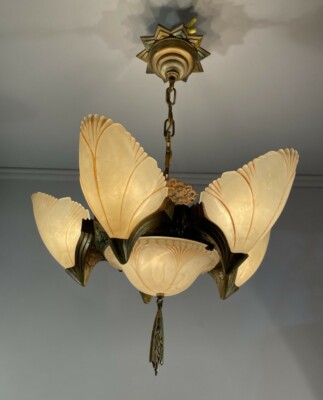 vintage antique art deco slip shade chandelier lightolier 5 shades 6 glass 1925 #1886309183