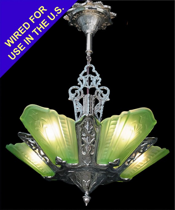 antique art deco chrome and green glass 5 light slip shade etsy